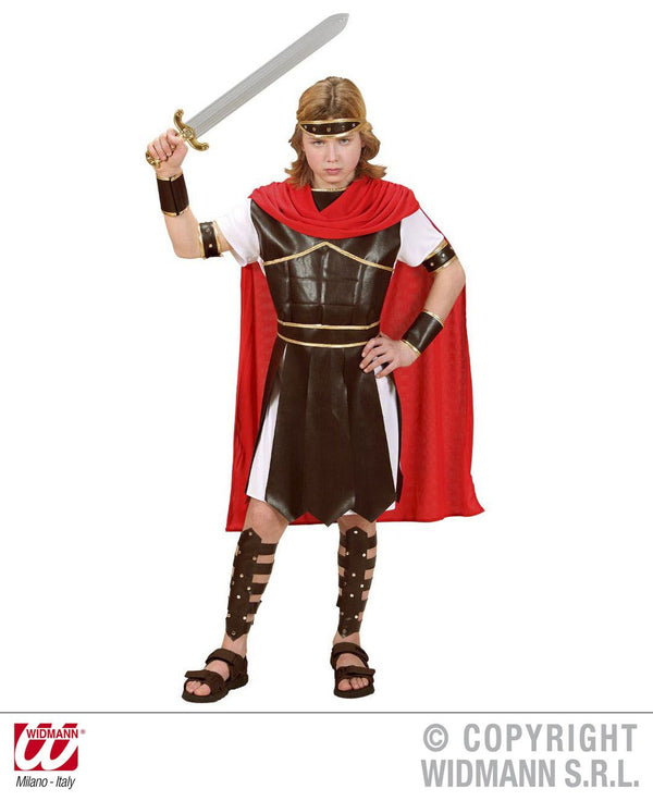 Costume da antico centurione romano. Nella confezione sono compresi la tunica con il mantello attaccato ed il casco morbido dorato. Non sono compresi i sandali, lo scudo e la spada...
