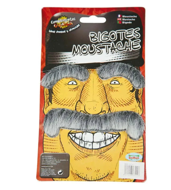 Set composto da baffi e sopracciglia grigi, folti e dalla forma buffa e stondata. Hanno l'adesivo per aderire al volto.