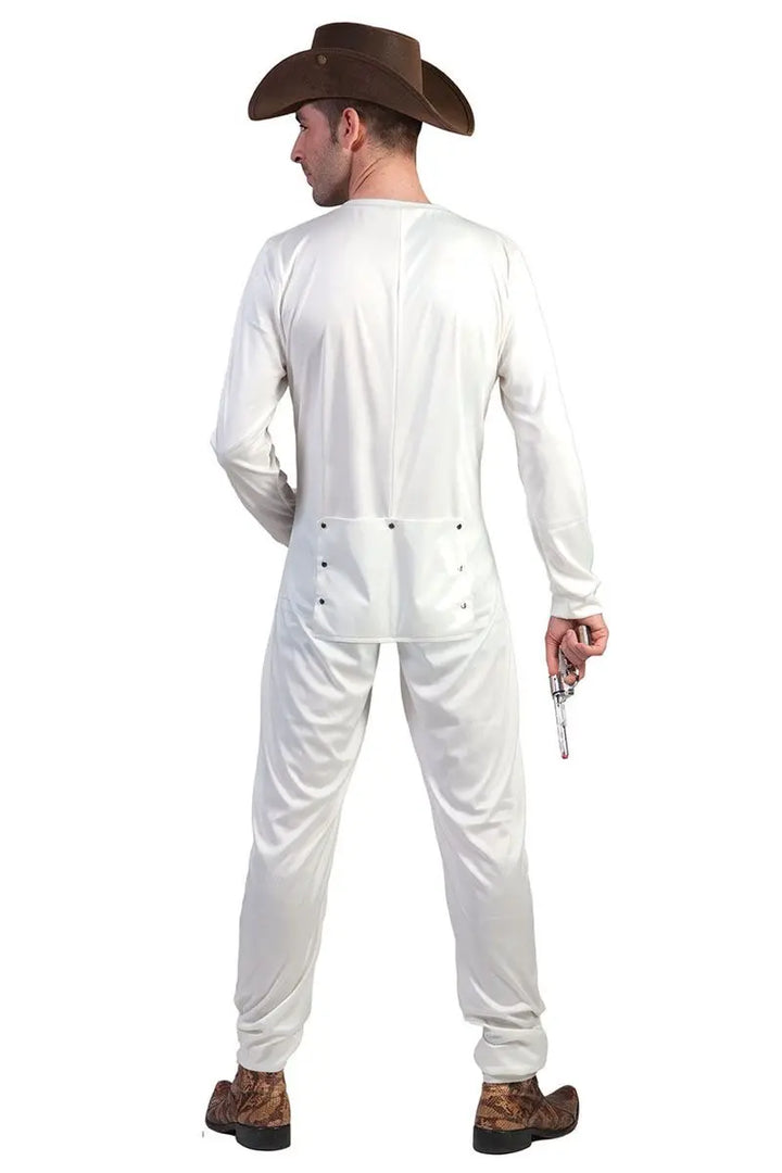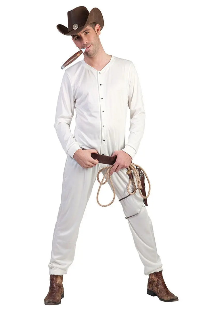 Se volete vestirvi a tema Far West, ma volete evitare i soliti Cowboy o sceriffo, ecco la trovata più divertente ed originale mai vista! Il costume si compone di una tuta intera color panna, con fila di bottoni anteriori e ... patta sul retro!<br />
