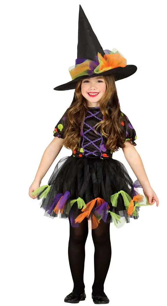 Costume da streghetta allegra. La confezione contiene il vestito e il cappello. Non sono comprese le scarpe e le calze.