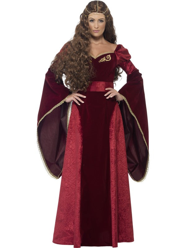 Meraviglioso costume che ti porterà in un viaggio indietro nel tempo! La confezione comprende il vestito lungo coor rosso scuro con maniche ampie svasate, cintura e accessorio per i capelli. Parrucca non compresa.