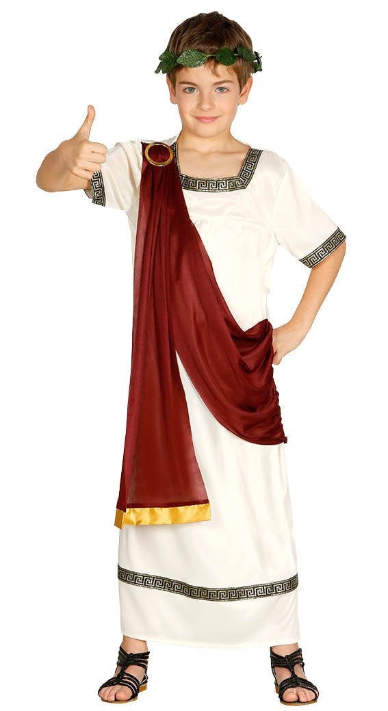 Costume da nobile romano antico. La confezione comprende la tunica bianca a mezze maniche con il drappo rosso cucito sulla spalla destra. Non compresi la corona d'alloro e i sandali.