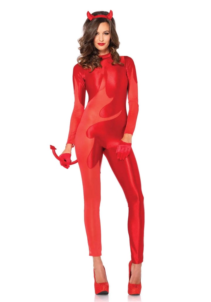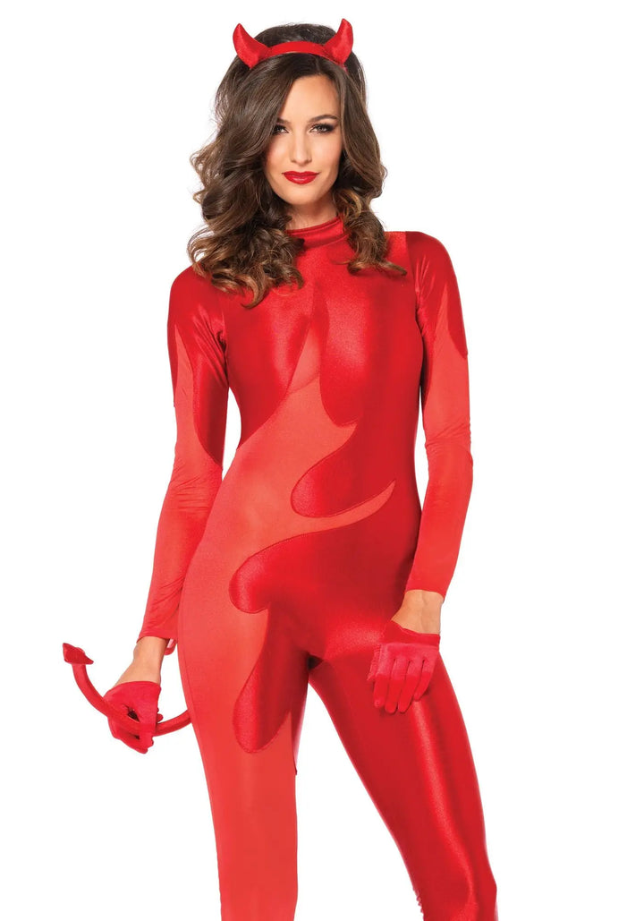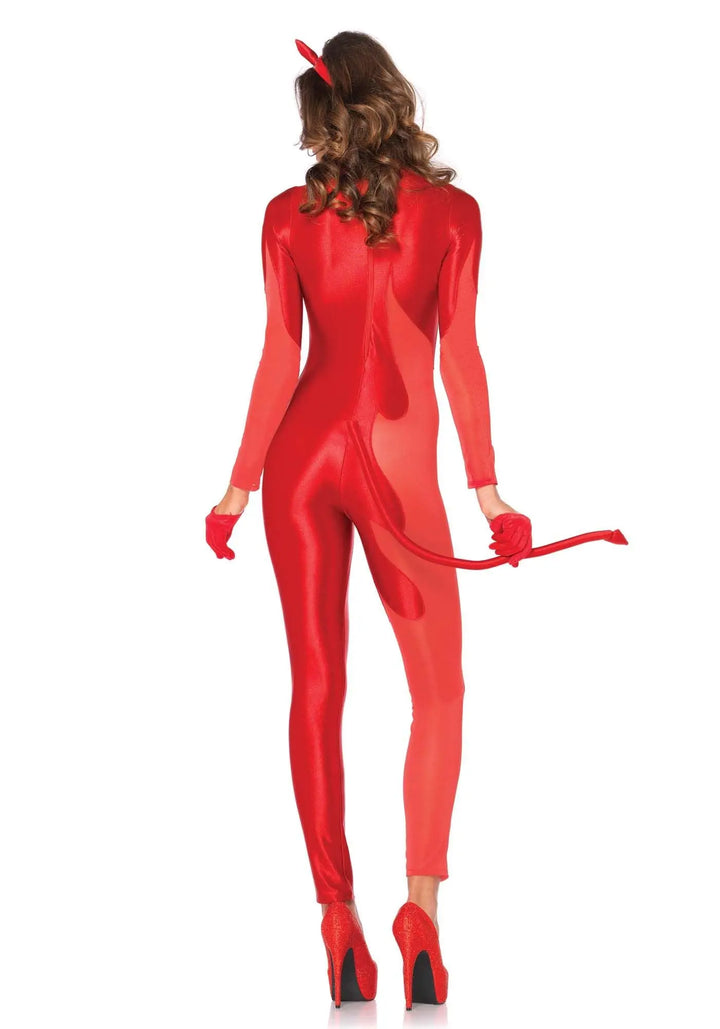 Affascinante costume da diavolo ardente.... Indossate questa tuta e nessuno potrà dirvi di no! La tuta è di morbidissima lycra elasticizzatissima e lucida con parti di tulle super elasticizzato che lasciano naturalmente intravedere la pelle. Sul retro il costume si chiude tramite zip. Coda attaccata imbottita e modellabile. Il cerchietto con dentini ha le corna imbottite della stessa stoffa. Nella confezione non sono compresi i guanti e le scarpe che si possono acquistare separatamente.