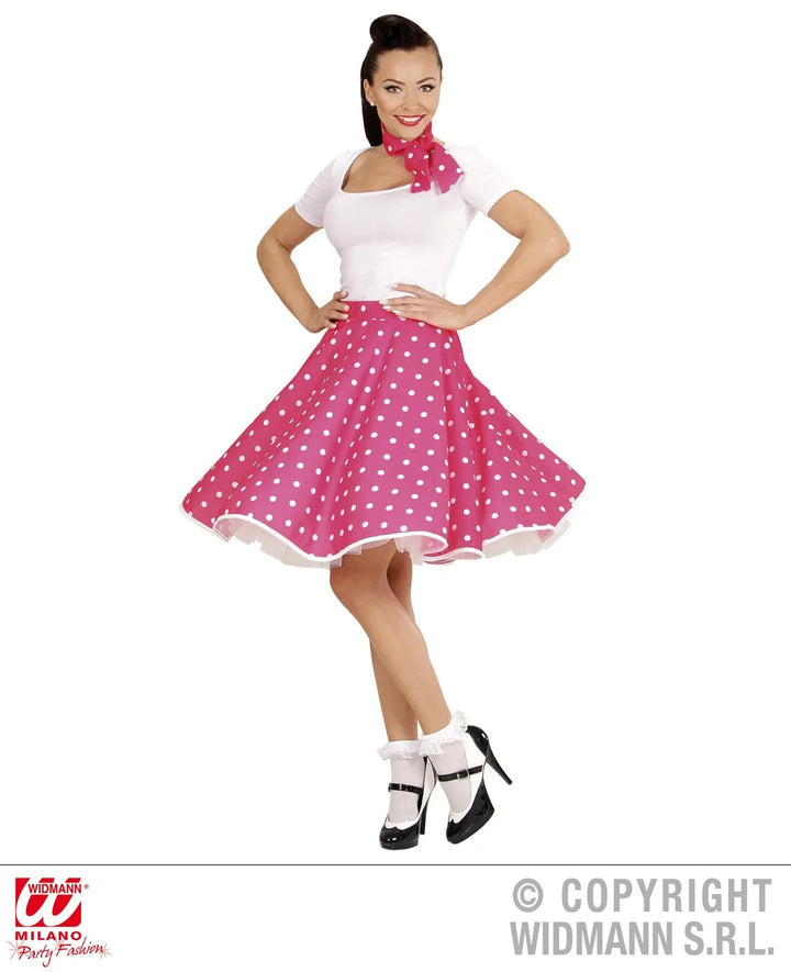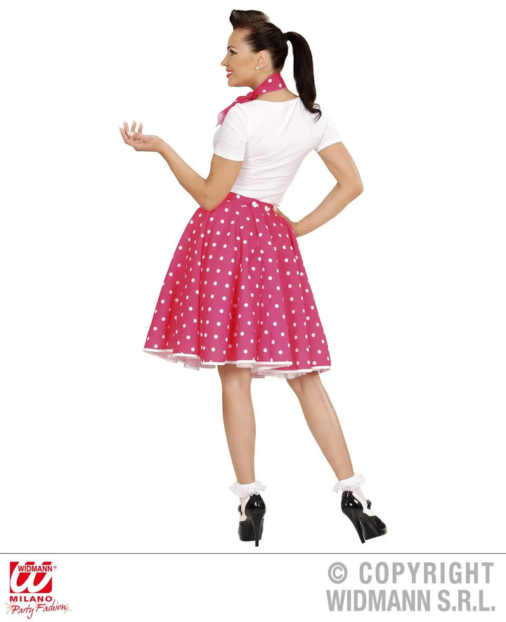 Meravigliosa gonna anni 50 veramente ben rifinita nei particolari! Adatta a feste a tema oppure per dare un tocco vintage al vostro look quotidiano. Modello a ruota lunghezza media, in tessuto rosa acceso con pois bianchi, bordo bianco e cinturino. Il cinturino è regolabile in vita con tre bottoni bianchi e due asole. Nella confezione è compreso anche il piccolo foulard a striscia della stessa stoffa. Non vi è la sottogonna.<br />