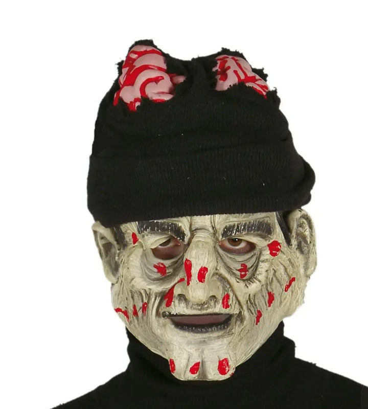 Maschera integrale con cappello attaccato dal quale escono parti di cervello.